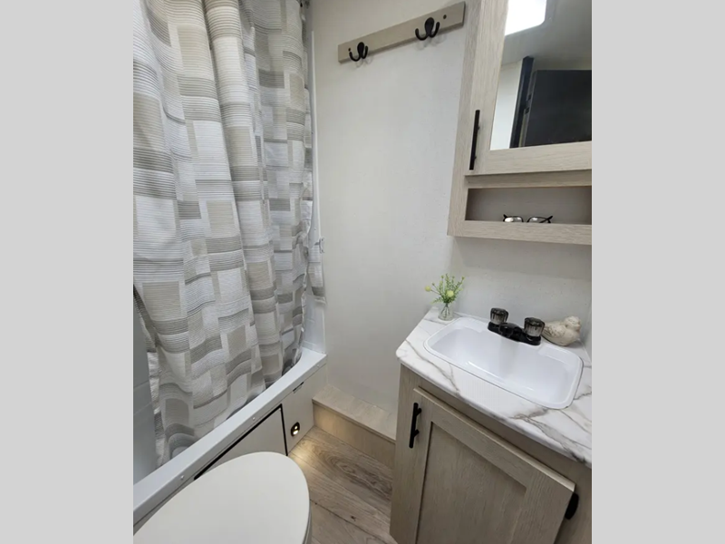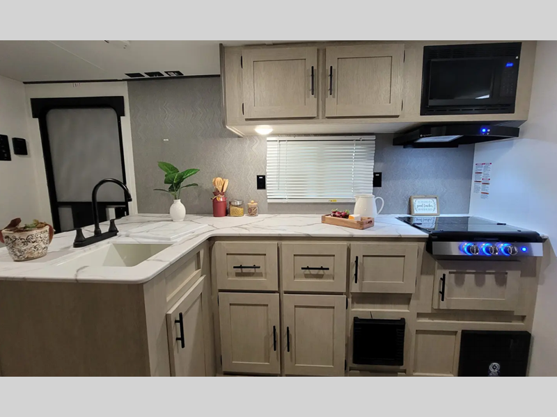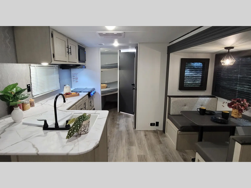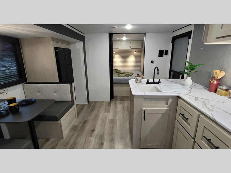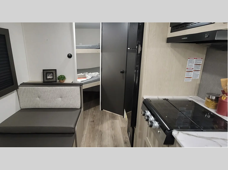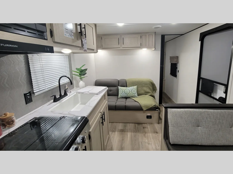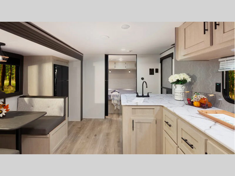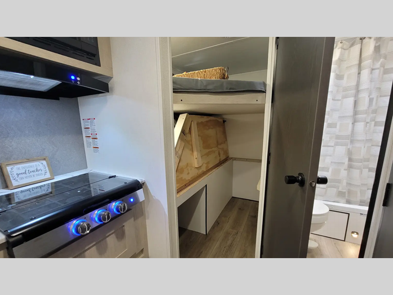 The enclosed underbelly will help protect against rock and debris as you travel to the campground, and the four stabilizer jacks will help keep you unit secure. Inside, a tankless water heater will provide endless hot showers and seamless countertops will be easy to keep clean. There are a few options that can be added to further customize your trailer, such as an optional power tongue jack and an optional 200W solar panel for off-grid capabilities.