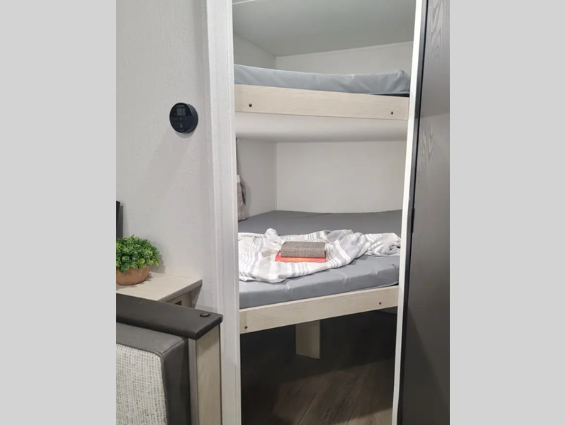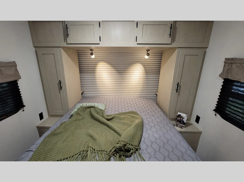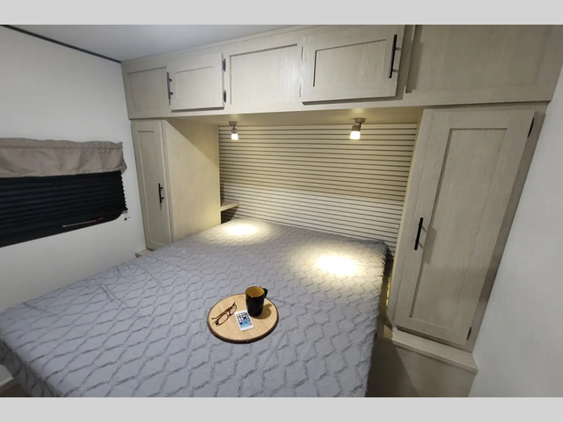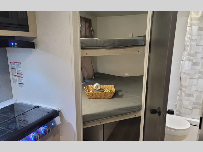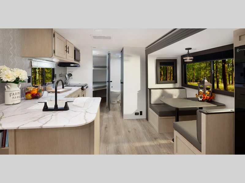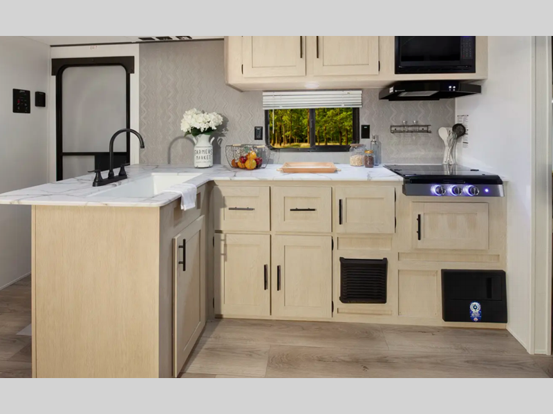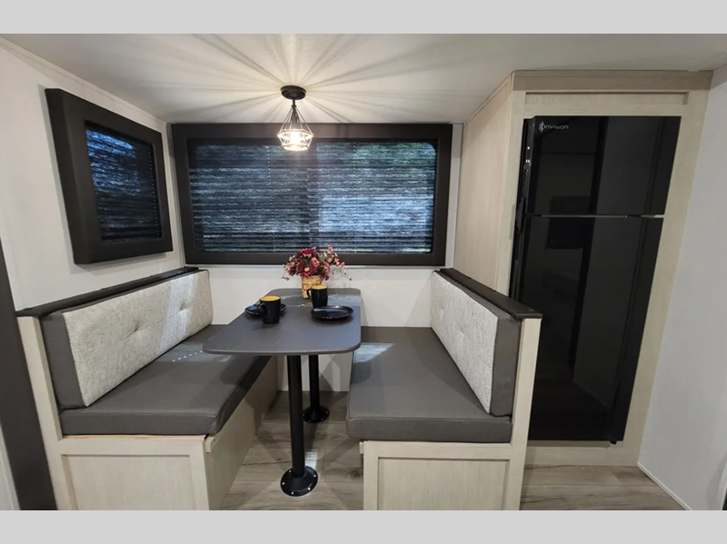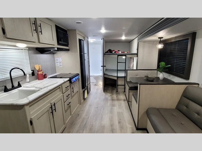 The enclosed underbelly will help protect against rock and debris as you travel to the campground, and the four stabilizer jacks will help keep you unit secure. Inside, a tankless water heater will provide endless hot showers and seamless countertops will be easy to keep clean. There are a few options that can be added to further customize your trailer, such as an optional power tongue jack and an optional 200W solar panel for off-grid capabilities.
